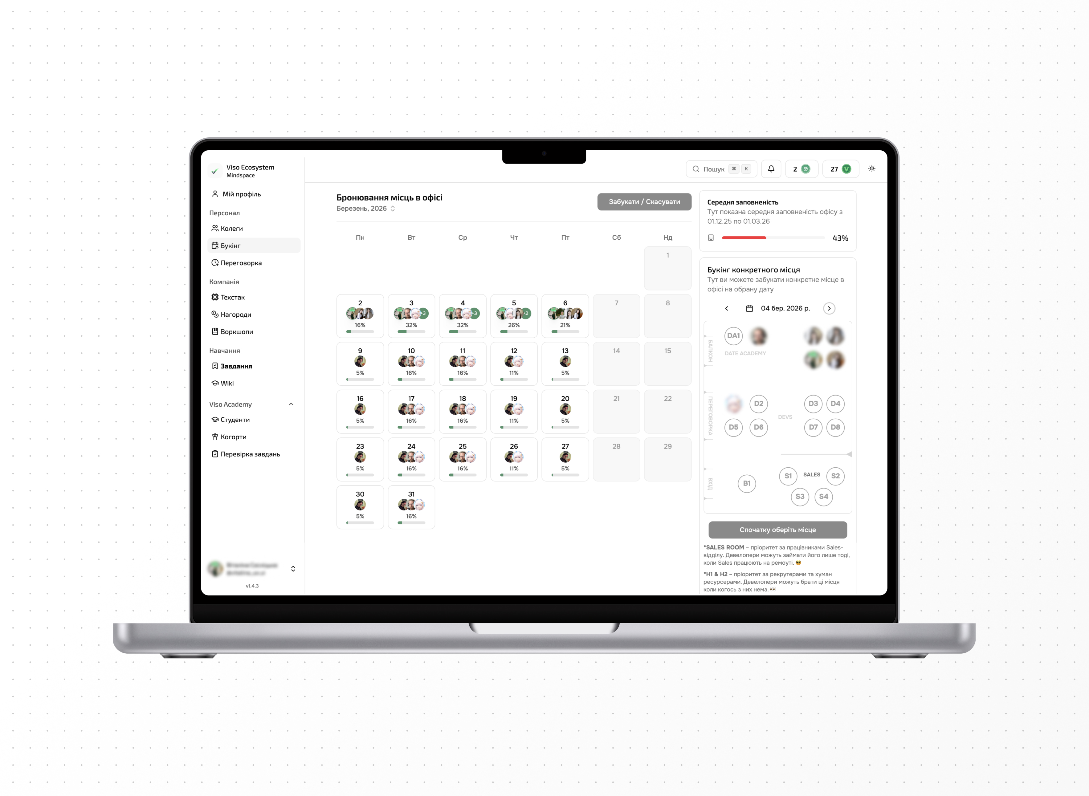 By consolidating personal insights, team data, workspace booking, and company activities into a unified interface, the platform reduces operational complexity and improves daily productivity.